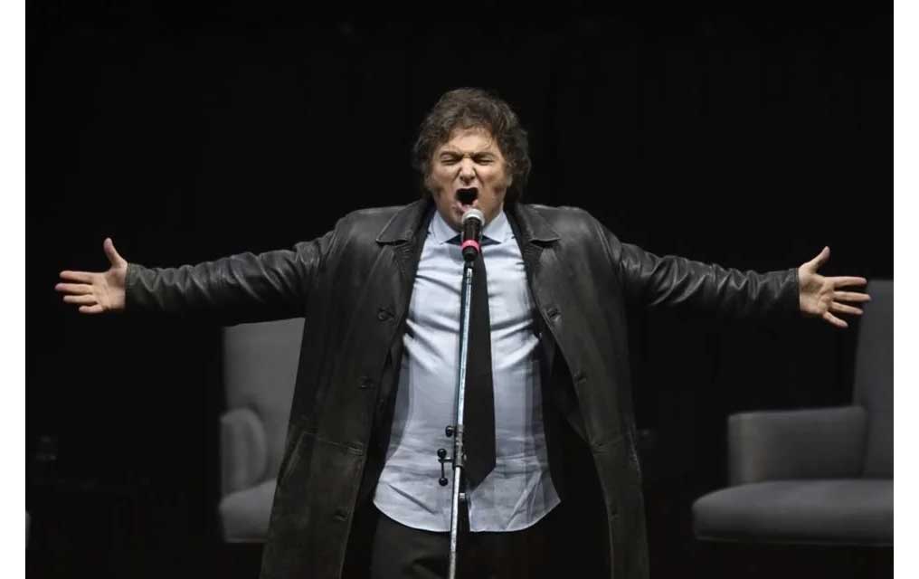 Vestido con un sacón de cuero, camisa y corbata, Milei salió al escenario del estadio cubierto Luna Park y fue recibido por más de 10 mil seguidores con un estruendoso grito de “libertad, libertad”. Mientras, una banda de rock comenzaba a tocar los primeros acordes del tema “Panic Show”, del popular grupo local La Renga, que Milei usó como himno durante su campaña presidencial.